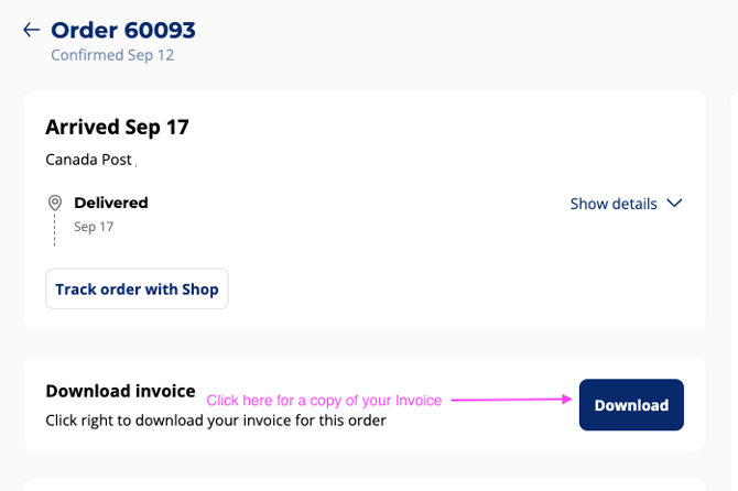 Log in to your Account, select the Order that you need the Invoice copy for, and you will be brought here: